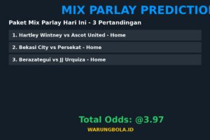 โ ๏ธ Disclaimer: Prediksi mix parlay ini bersifat informasi dan edukasi. Kami tidak bertanggung jawab atas kekalahan taruhan. Pastikan untuk bermain di situs terpercaya dan bertanggung jawab. Info lebih lanjut kunjungi WarungBola.