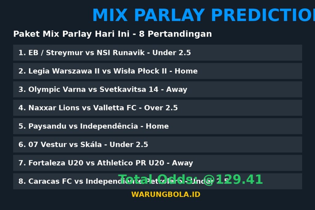 ⚠️ Disclaimer: Prediksi mix parlay ini bersifat informasi dan edukasi. Kami tidak bertanggung jawab atas kekalahan taruhan. Pastikan untuk bermain di situs terpercaya dan bertanggung jawab. Info lebih lanjut kunjungi WarungBola.
