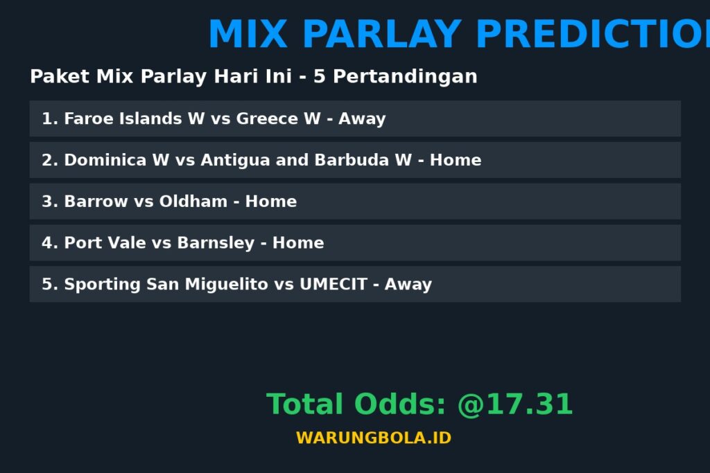 Paket Mix Parlay ini terdiri dari 5 pertandingan dengan total odds @17.31. Setiap pertandingan telah kami analisis menggunakan data statistik, head-to-head, dan performa tim terkini.