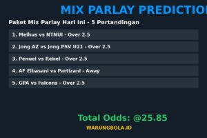 Paket Mix Parlay ini terdiri dari 5 pertandingan dengan total odds @11.26. Setiap pertandingan telah kami analisis menggunakan data statistik, head-to-head, dan performa tim terkini.