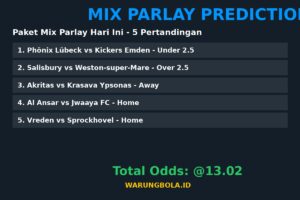 โš ๏ธ Disclaimer: Prediksi mix parlay ini bersifat informasi dan edukasi. Kami tidak bertanggung jawab atas kekalahan taruhan. Pastikan untuk bermain di situs terpercaya dan bertanggung jawab. Info lebih lanjut kunjungi WarungBola.