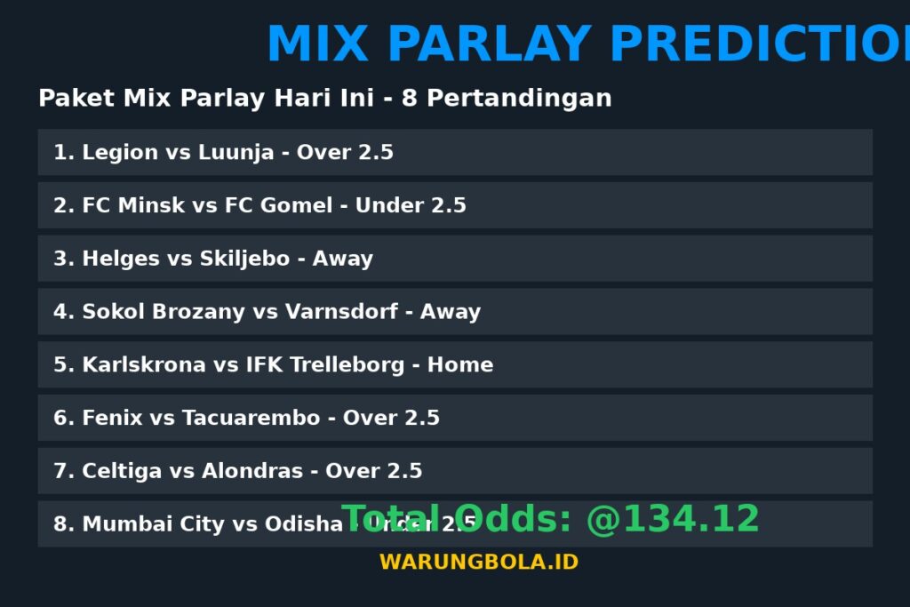 Mix Parlay terbaik dan terakurat hari ini telah kami susun berdasarkan analisis mendalam dari berbagai liga top Eropa dan dunia. Paket mix parlay ini terdiri dari 8 pertandingan pilihan dengan total odds menguntungkan @134.12. Setiap pertandingan telah kami analisis menggunakan data statistik terkini, head to head, dan performa tim untuk memberikan prediksi yang akurat dan terpercaya.