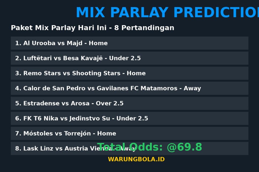 Mix parlay jitu dengan pertandingan-pertandingan pilihan berkualitas. dengan total odds menguntungkan @69.8. Setiap pertandingan telah kami analisis menggunakan data statistik terkini, head to head, dan performa tim untuk memberikan prediksi yang akurat dan terpercaya.