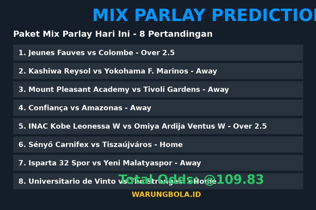 Mix parlay jitu dengan pertandingan-pertandingan berkualitas dan peluang menang optimal. Paket ini terdiri dari 8 pertandingan dengan total odds menguntungkan @109.83. Setiap pertandingan telah kami analisis menggunakan data statistik terkini, head to head, dan performa tim untuk memberikan prediksi yang akurat dan terpercaya.