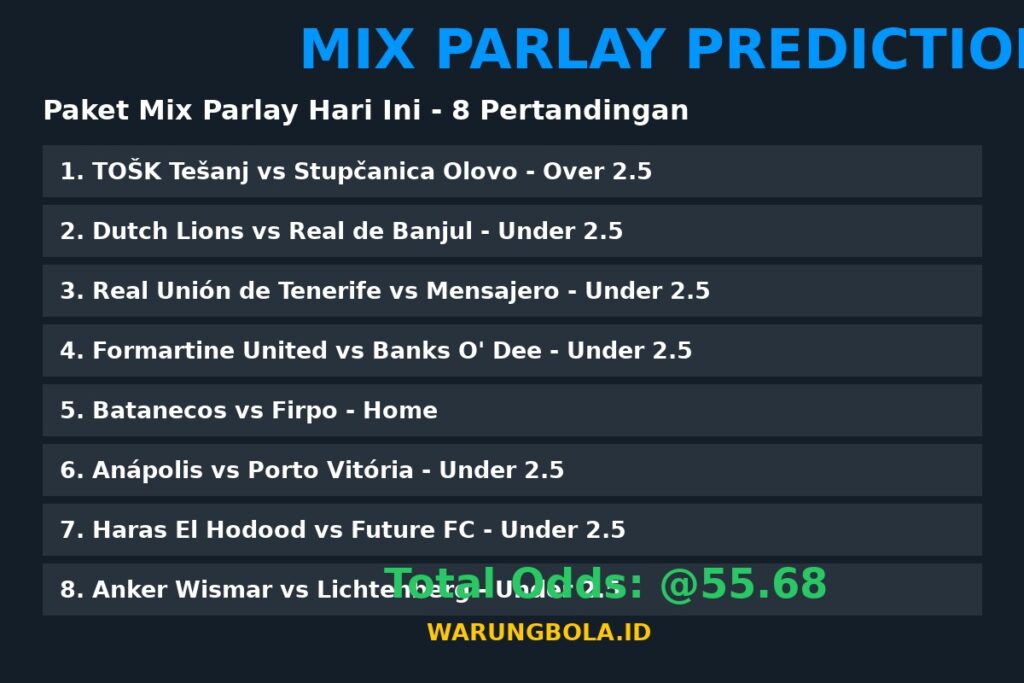 ⚠️ Disclaimer: Prediksi mix parlay ini bersifat informasi dan edukasi. Kami tidak bertanggung jawab atas kekalahan taruhan. Pastikan untuk bermain di situs terpercaya dan bertanggung jawab. Info lebih lanjut kunjungi WarungBola.