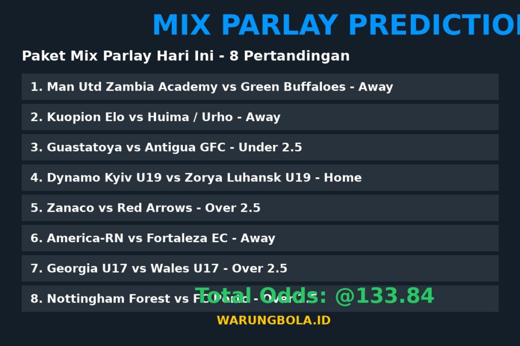 Paket Mix Parlay ini terdiri dari 8 pertandingan dengan total odds @133.84. Setiap pertandingan telah kami analisis menggunakan data statistik, head-to-head, dan performa tim terkini.
