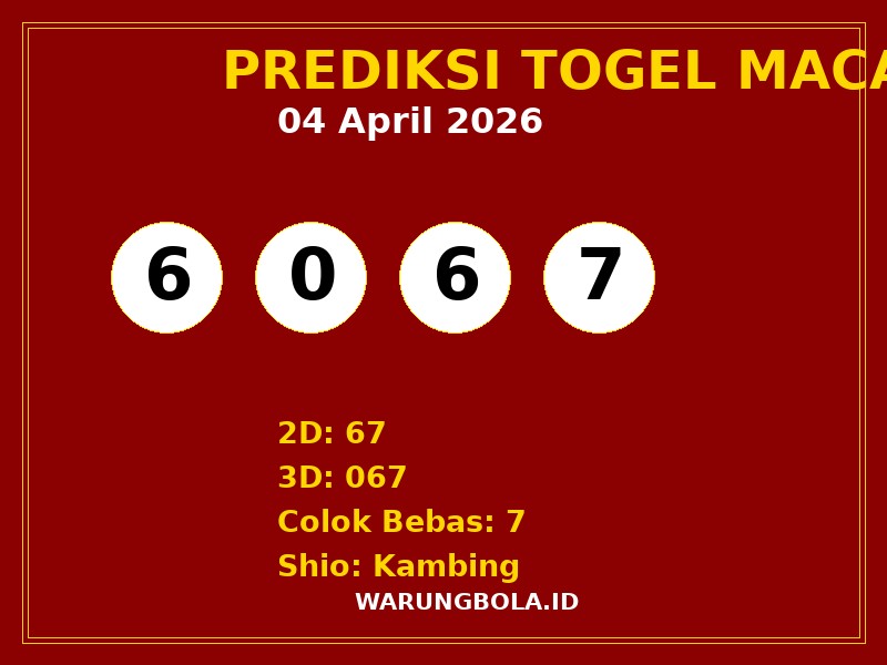 Prediksi togel Macau hari ini telah kami susun menggunakan rumus matematika, statistik keluaran sebelumnya, dan analisis pola angka. Angka-angka yang kami berikan meliputi 4D, 3D, 2D, Colok Bebas, Colok Macau, Colok Naga, Shio, dan berbagai jenis taruhan togel lainnya. Gunakan prediksi ini sebagai referensi untuk meningkatkan peluang kemenangan anda.